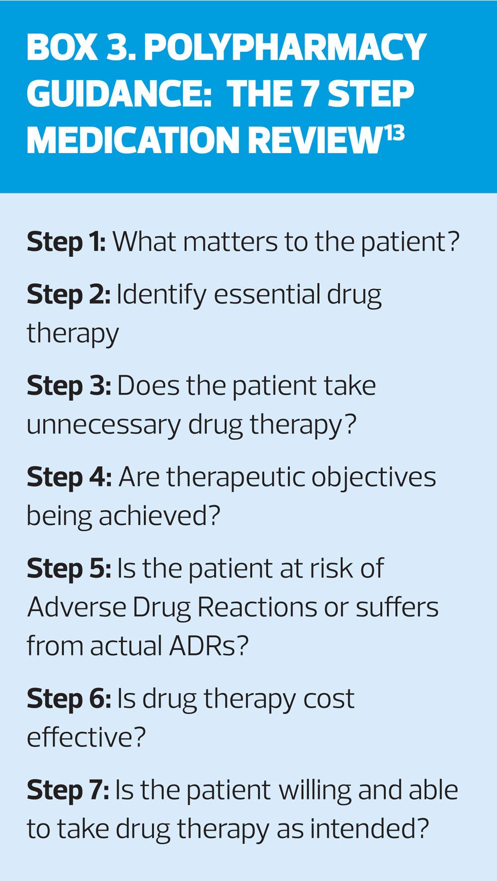 FURTHER READINGPractice Nurse ‘Guidelines in a Nutshell’ summary of Polypharmacy Guidance, Realistic Prescribing, August 2018 (Online only) Morrow G. Multimorbidity: implications for general practice nurses. Practice Nurse 2018;48(10):12-16Bryant E, Oliver L. The Year of Care - planning together for effective care. Practice Nurse 2016;46(3):36-40