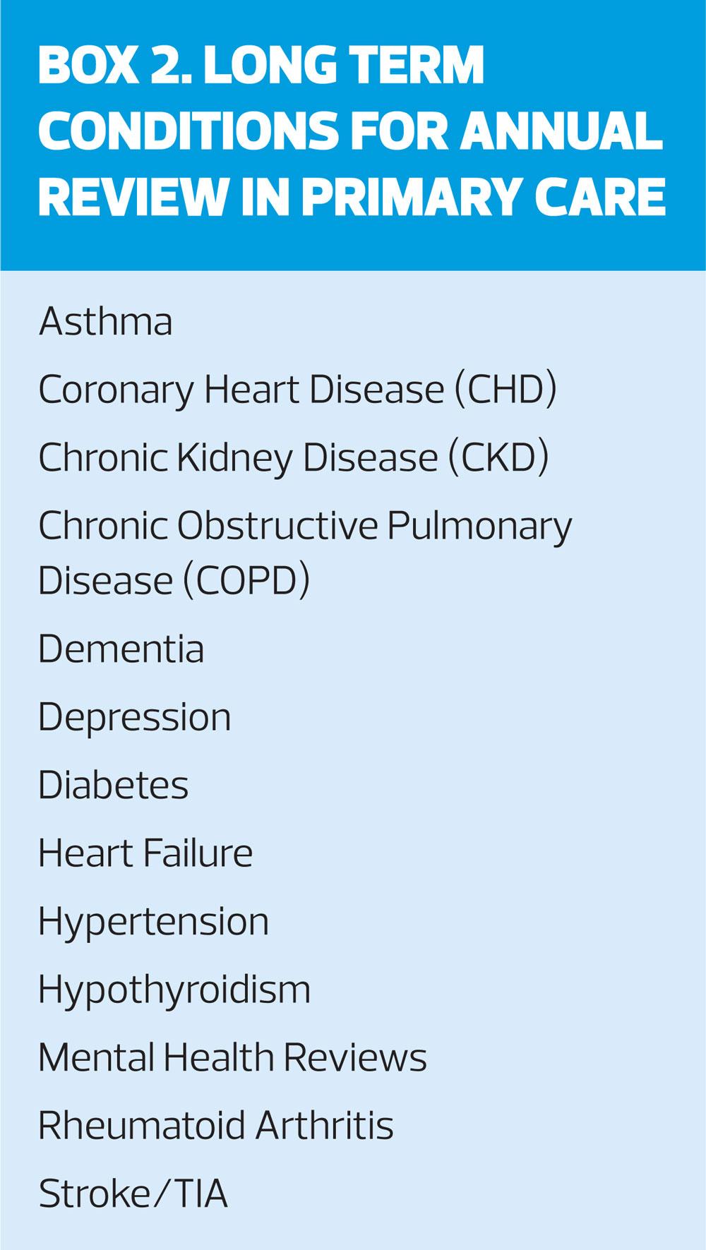 Annual reviews of LTCs conducted by general practice nurses are often split up into disease areas (Box 2), driven essentially by the contractual obligation of the Quality and Outcomes Framework (QOF).6 This review gives us the opportunity to not just ‘tick the boxes’ but to develop a relationship with our patients, understand the impact and burden their ill-health has on their wellbeing and to plan together an ongoing supported self-managed approach to care to improve their quality of life and reduce the risk of crisis management. A person living with an LTC lives with that condition – or conditions – every single day of their life to a greater or lesser extent and, as nurses we need to ensure that our 20-30 minute contact (if we’re lucky) goes some way to improve that daily burden.
