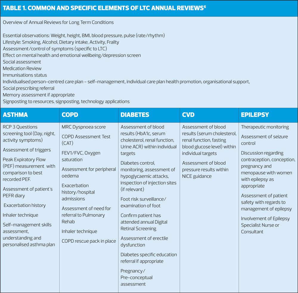 Clearly there are very specific assessments and management that we need to undertake for individual long term conditions beyond a more generic assessment of health and wellbeing. Table 1 shows elements to the LTC review that are shared by annual reviews and details the specifics of some of the reviews we carry out in primary care. By fine-tuning our reviews we can avoid duplication for our patients who have more than one LTC in an attempt to reduce visit numbers and time, and improve continuity of care.