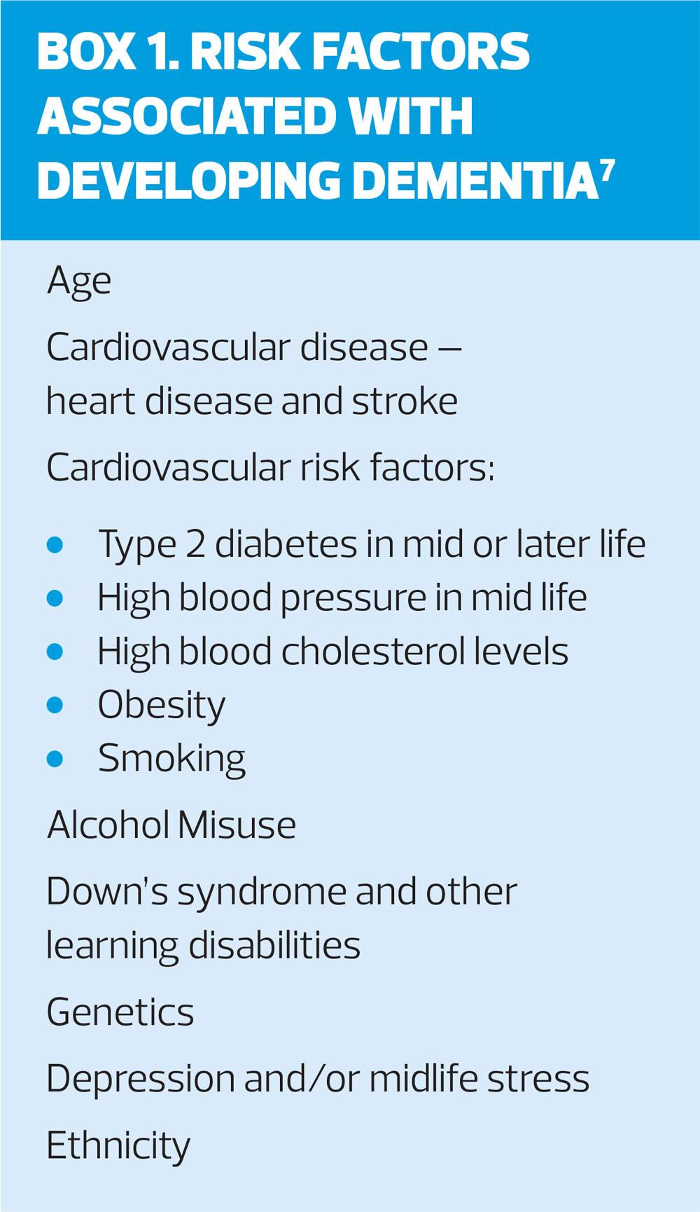 Implementing opportunistic dementia screening in high risk patients (Box 1) and supporting timely diagnosis of dementia for those with comorbid conditions can better inform treatment plans, identify the correct support needed to manage conditions safely and effectively and reduce risk of crises. Equally, identifying and managing comorbid conditions in patients diagnosed with dementia can improve cognition and functioning and improve the quality of life for the person with dementia and their family carers.
