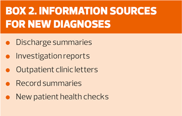 Disease registers need to be continually updated with new diagnoses as they are made, not only by the GPs and GPNs, but also by other members of the multidisciplinary team and secondary care. This information comes from a variety of sources (see box 2). Mechanisms need to be in place to ensure that this information is captured and recorded in a retrievable format. It needs to be clear whose responsibility it is to enter this information on the clinical system and standardised READ codes must be used.