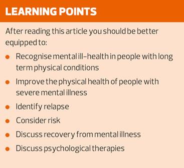 Patients with SMI often have complex needs, requiring on-going input from a multi-disciplinary mental health care team. Practice nurses have an important role in the follow-up of such patients, after they have been discharged from secondary care.