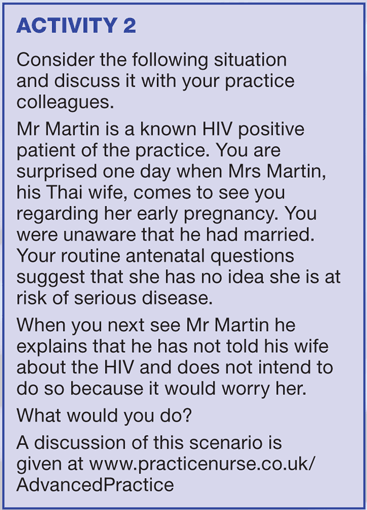 Your first step is therefore to attempt to get Mr Martin to tell his wife about his HIV status and to discuss safe sex, which will protect her. He needs to be advised that she will routinely be offered HIV testing in pregnancy.