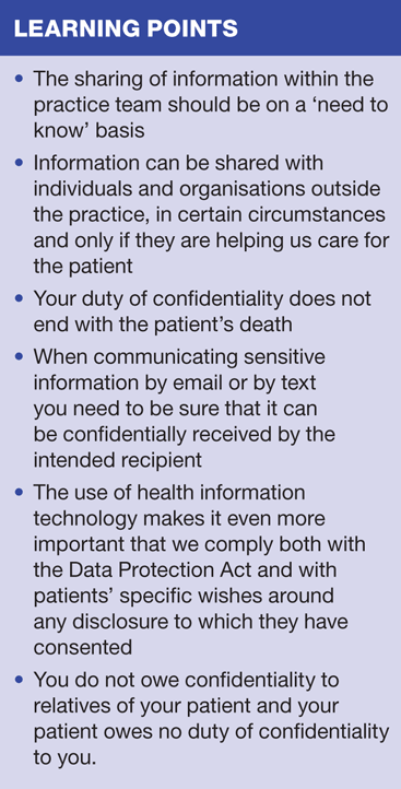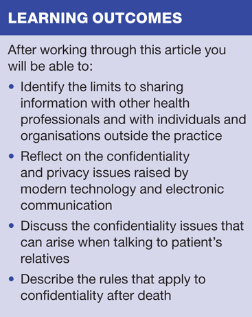 This, the second article in a series on confidentiality, looks at the issues raised in sharing patient information with others, both within and outside the practice, talking to relatives and carers and the rules that apply to confidentiality after a patient’s death. It explores the issues around confidentiality and privacy in an electronic age and will present you with further hypothetical problem cases to discuss within your practice team.