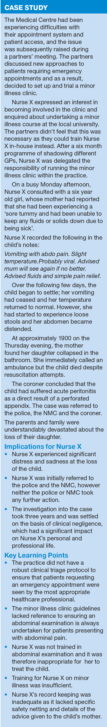 With this in mind, nurses need to be aware that they have a professional responsibility to ensure that they make a timely and appropriate referral to another practitioner when it is in the best interests of the individual requiring any action, care or treatment. It is important to note that according to the General Medical Council (GMC), GPs also have a professional responsibility to ensure that when delegating to a member of the healthcare team, that person has the ‘knowledge, skills and experience to provide the relevant care or treatment; or that the person will be adequately supervised.’4