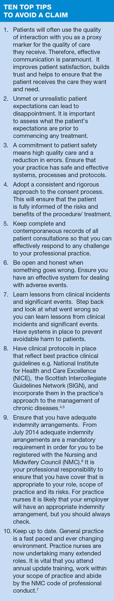However, claims against nurses in general practice are on the increase and it is important that you consider incorporating the top tips into your current practice.