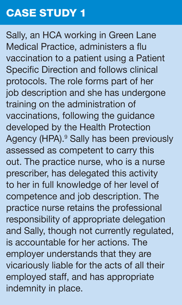 In many practices, GPs delegate the task of administering certain injections, such as flu and pneumococcal vaccinations and vitamin B injections, to HCAs. Some HCAs are now being asked to administer pertussis vaccination for pregnant women.7