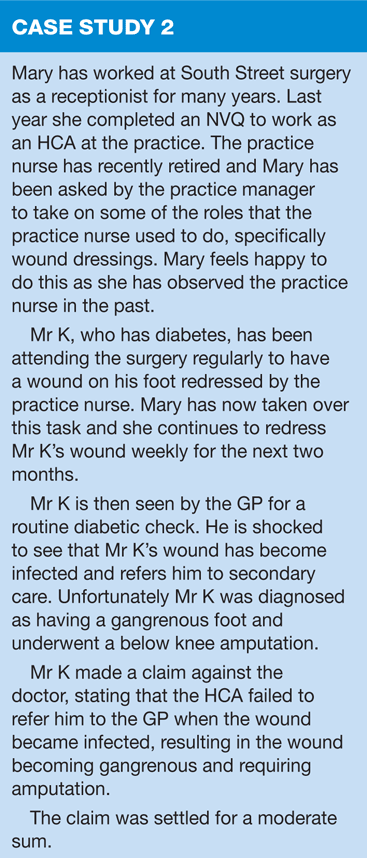 Employing GP partners are vicariously liable in law for the acts and omissions of the HCA. Their own indemnity arrangements are unlikely to extend to their vicarious liability for HCAs, so it is important that they ensure that all HCAs have adequate indemnity arrangements in place for the tasks they undertake. It is essential that practices inform their medical indemnity organisation, such as MPS, of tasks that the HCA is undertaking to ensure that adequate indemnity arrangements are in place.