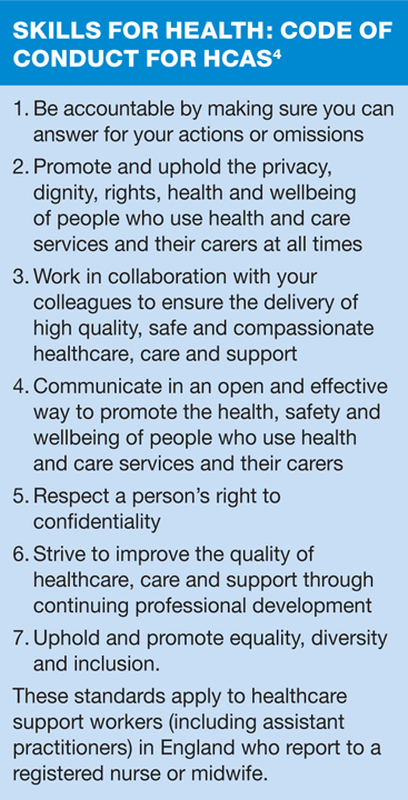 'Skills for Health' (commissioned by the Department for Health) has recently developed a Code of Conduct and National Minimum Training Standards for healthcare support workers in England.4 The Code describes the standards of conduct, behaviour and attitudes expected of HCAs and The National Minimum Training Standards define the minimum knowledge HCAs must have. Working within these guidelines will ensure that new HCAs have the key knowledge and understanding required for their role from the start.