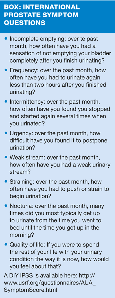 If this does open a line of conversation, try the questions in the box. They're based on the International Prostate Symptom Score (IPSS), the use of which forms part of the NICE guidance on dealing with lower urinary tract symptoms (LUTS). At this early stage, and even if the man isn't forthcoming, make it clear that these sort of things are not an inevitable part of getting older and that they can be treated. Mention the significant improvements to quality of life that other patients or friends have experienced - 'after all if you can't sleep you can't do anything'.