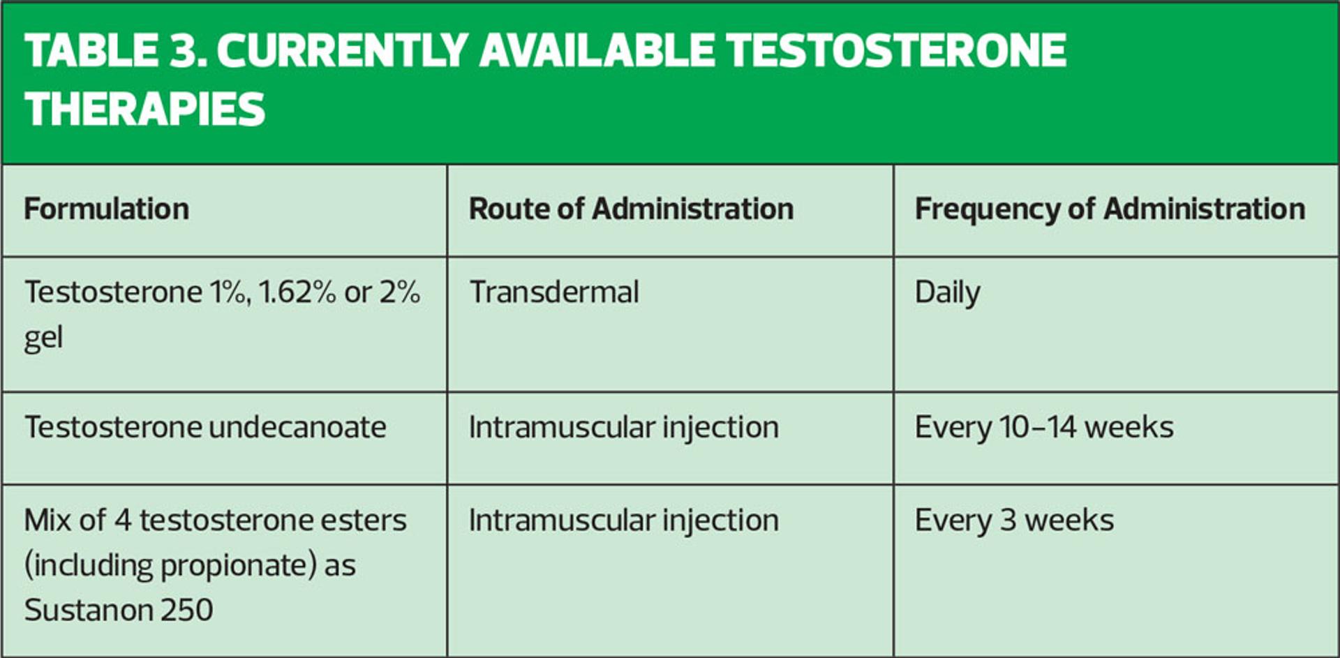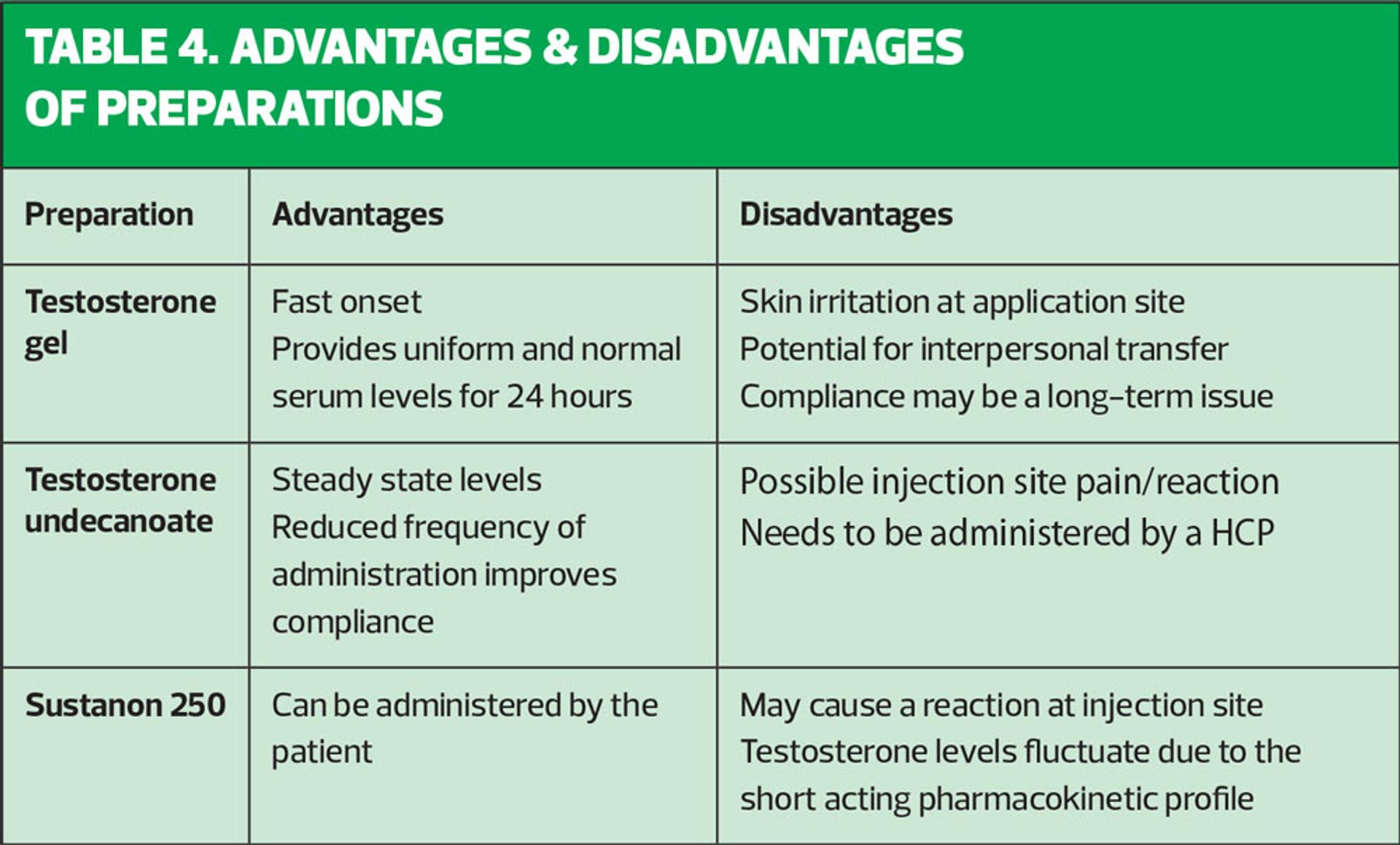 There are several testosterone preparations available that differ in their route of administration. The patient should be fully informed about the expected benefits and side effects of each in order that he can make an educated decision on choice of treatment (Tables 3,4).