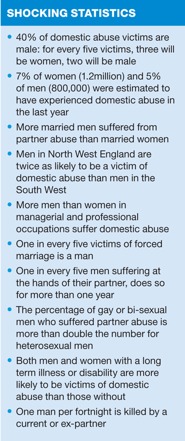 Statistics would suggest that a staggering 2.9 million, or one in six men, have suffered some kind of domestic abuse since the age of 16 years. Furthermore there have been an estimated 800,000 male victims of domestic abuse during the last year. For every five victims of domestic abuse, three will be women, two will be men.