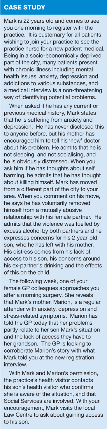 Read the case study. Is this your surgery? Would you have identified this man as a victim of domestic abuse? Would you have believed his story? Do you see every patient who registers with the practice? If not, is this a missed opportunity for all sorts of screening activity? Would you have picked up the cues in the conversation?