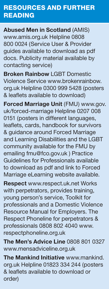 8. Understanding the perpetrators of abuse against men: there is currently no service for perpetrators of abuse (either men or women) in Scotland, however, the charity Respect does work with perpetrators and offers a telephone helpline and website (see sources of information).