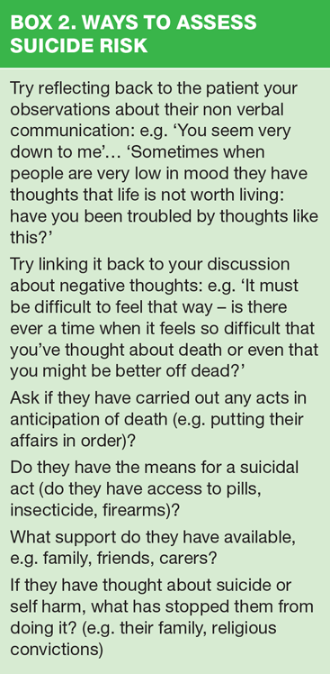 Establishing the suicide risk is an important part of the assessment of anyone who has possible symptoms of depression as it helps you to work out how urgently you need to arrange further investigation and treatment. (Box 2) Asking about suicide can be difficult and obviously needs to be tailored to the particular individual. There is no evidence that asking about suicide increases the potential risk of suicide,8 and often patients are actually relieved to be able to talk about their feelings.