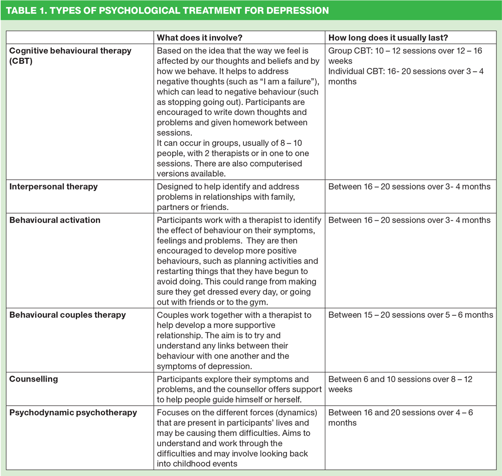 Having a working knowledge of what is involved in different types of psychological therapies can be helpful for patients. Which treatment they are offered should depend as much on their preferences as it does on what options are available.1 However, that involves asking patients to make choices about things that are unfamiliar to them at a time when they may already be struggling with decision-making. Being able to use a familiar healthcare professional as a sounding board can really help.