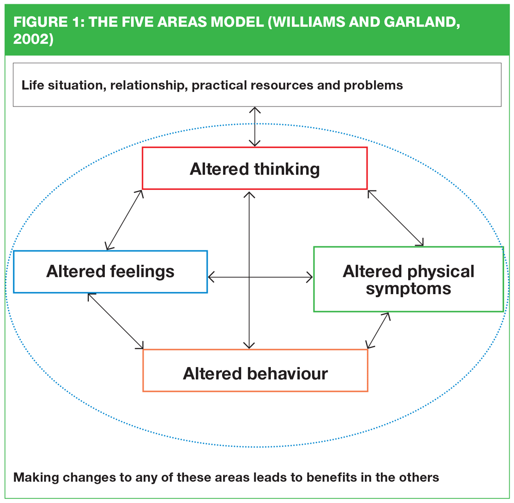 In Jane’s situation you could also consider some cognitive behavioural therapy (CBT), particularly if you discover that her anxiety is also affecting other situations, such as her relationships. CBT will concentrate on the ‘here and now’ seeking to challenge Jane’s thoughts and behaviours. Thinking about the ‘five areas model’2 (Figure 1) may be helpful in this regard. It may also be that she needs to try and make sense of what happened to her in the past, which may need some longer term, more psychodynamic focussed interventions.