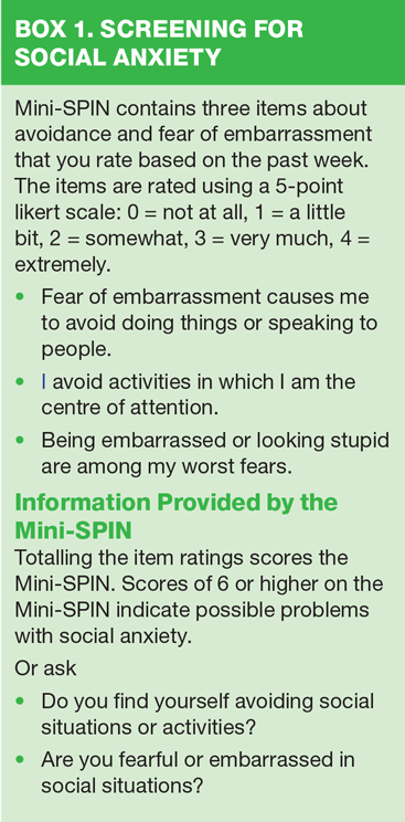Treatment with an SSRI, such as escitalopram or sertraline, can be particularly beneficial and it is sobering to consider that the majority of patients suffer for an average of 15 to 20 years before seeking treatment, and half of those who suffer never seek help at all. Being alert to the possibility of social phobia, and using screening tools, such as the mini-SPIN4 (Box 1) can help to start to address this potential iceberg of untreated distress. CBT also has a role to play, particularly involving gradual/progressive exposure in facing up to the feared situation with the support of a therapist in an attempt to desensitise to the potential stimulus.