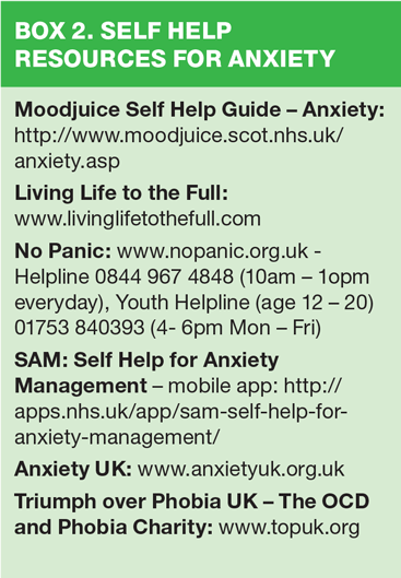 Sometimes early intervention can prevent anxiety from escalating into an uncontrollable disorder that has a significant impact on an individual’s life.1 An example of this might be the patient who presents to the emergency department with chest pain and shortness of breath that is subsequently diagnosed as a panic attack. Often such individuals will be discharged home, once a serious underlying disorder has been excluded, and encouraged to contact their GP if they need further help. Many of them however will be embarrassed about their situation and so will not make contact with primary care services. Some of them will not have any further panic attacks, or at least suffer them very infrequently. Others however may go on to have recurrent issues, and then often develop anticipatory anxiety where they even become disabled between attacks by worry about the next attack coming on. Making contact with patients after their first panic attack can help to reduce the number who develop a full blown panic disorder, and such patients can often be signposted to self help strategies that they can explore (see box 2). Such interventions also help to diminish the stigma that may otherwise be associated with the discovery that their symptoms are attributable to an emotional rather than a physical disorder.