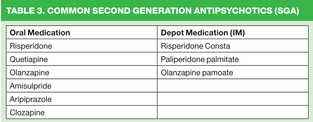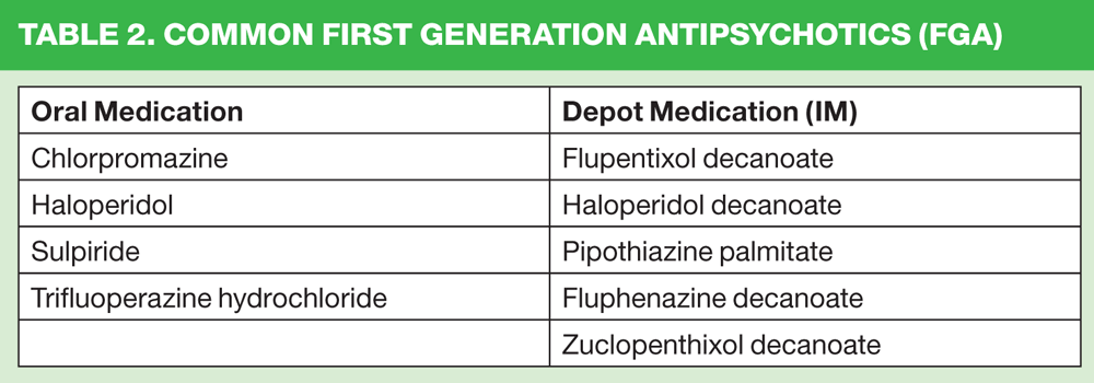 There are two groups of medications, 'first-generation antipsychotics' (FGAs) previously referred to as 'conventionals' or 'typicals' (Table 2) and 'second generation antipsychotics' (SGAs) (Table 3) previously called 'atypicals'. They are used in the treatment and management of schizophrenia, treatment of acute episodes, for relapse prevention, for emergency treatment of acute behavioural disturbance (rapid tranquillisation) and to reduce symptoms. Olanzapine, quetiapine and risperidone (SGA) are also licensed in the UK for the treatment of acute mania. They are available as oral and intramuscular preparations, or as medium — or long-acting depot intramuscular (IM) preparations.