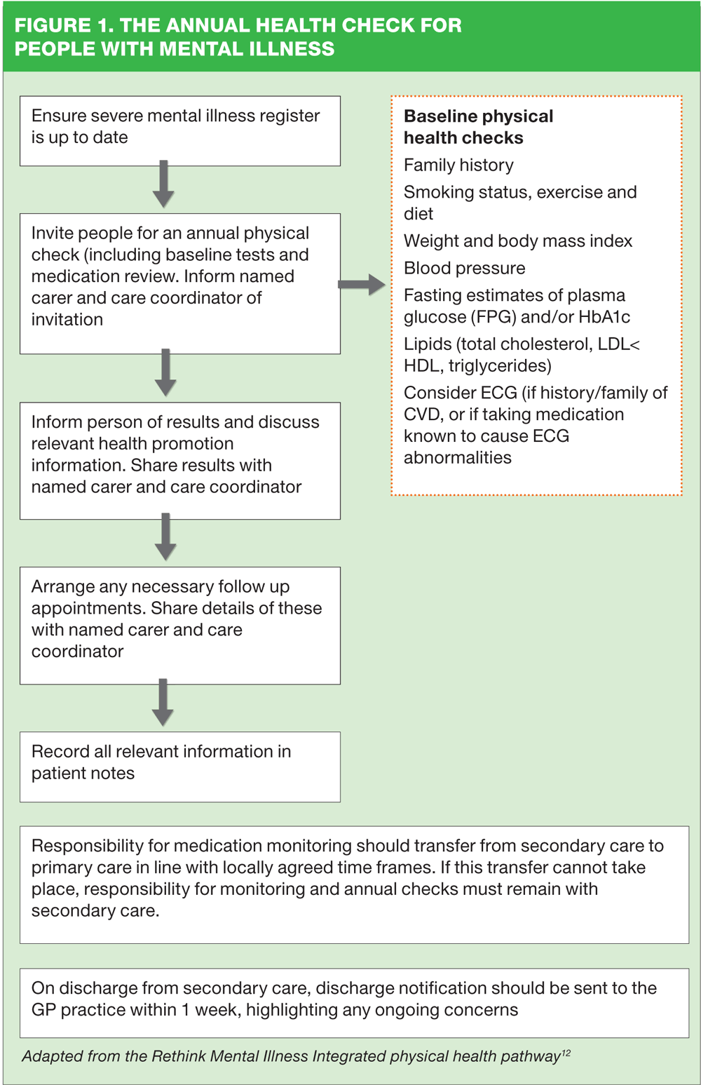It is now accepted that people with psychotic illnesses are also at a higher risk of physical illness compared with the general population, so it is important to monitor their physical health at least once a year. The main focus should be on cardiovascular disease risk assessment because of patients with these conditions are at higher risk than the general population.1 General physical assessment should encompass smoking, poor diet and lack of exercise. In addition, antipsychotic drugs may affect glucose regulation, increasing the risk of the metabolic syndrome, (hypertension, central obesity, glucose intolerance or insulin resistance and dyslipidaemia), which is a predictor of Type 2 diabetes and coronary heart disease. Rethink Mental Illness, Royal College of Nursing, Royal College of General Practitioners and Royal College of Psychiatrists have developed an integrated physical health pathway, which sets out the for primary role and responsibilities for monitoring the physical health of patients with mental health conditions.12 See Figure 1.