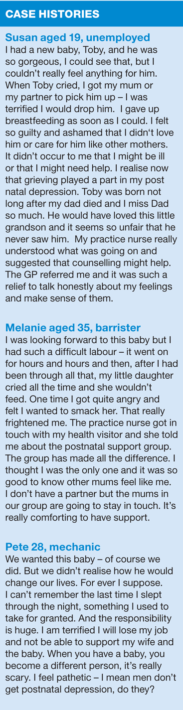 If the mother answers yes to the third question, we can reassure her that what she is experiencing is not peculiar to her and there are effective treatments. We may not be equipped to diagnose PND and it is essential we liaise with our colleagues, the GP, midwife and or health visitor, letting them know our concerns. But practice nurses are well placed to signpost routes to emotional and practical support.