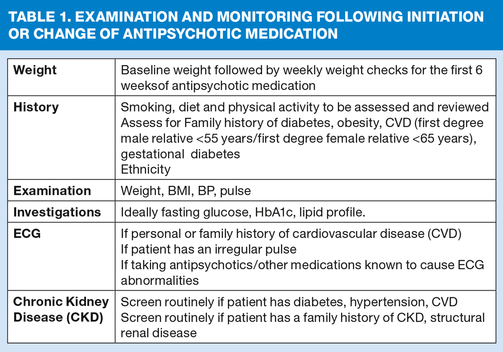 Weekly weight measurement is recommended for the first 6 weeks of taking antipsychotic medication. Early rapid weight gain is a predictor of severe long-term obesity and therefore early detection of weight gain is vital. Further assessment is recommended 12 weeks after commencement of medication to determine any deterioration, with the baseline examination repeated annually (Table 1).