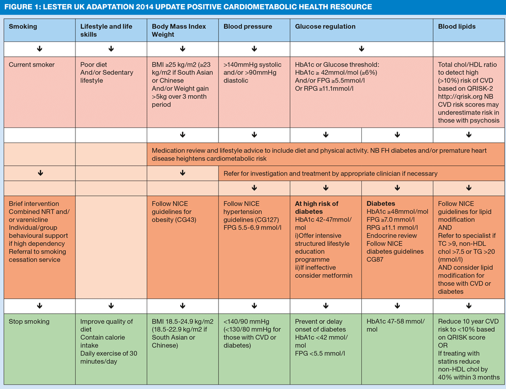 The Lester UK adaptation of the Positive Cardiometabolic Health Resource 2014 is a framework that has been developed, and recently updated, to aid health professionals identify the risks of cardiovascular disease and type 2 diabetes in patients with psychosis who take antipsychotic medication.7 (Figure 1) It has been developed by the Royal College of Psychiatrists Centre for Quality Improvement, the Royal College of General Practitioners Clinical Innovation and Research Centre and the Royal College of Nursing as part of the National Audit on Schizophrenia. In addition to being a tool to identify cardiometabolic risks, the purpose of the framework is to provide guidance for intervention and treatment, alongside NICE guidance, to reduce those risks and improve the health outcomes for this vulnerable group. The key message is ‘Don’t just screen – Intervene’.7 It supports both NHS England’s commitment to reduce premature mortality in people with severe mental illness and the implementation of the 2014-15 physical health Commissioning for Quality and Innovation (CQUIN).1,8