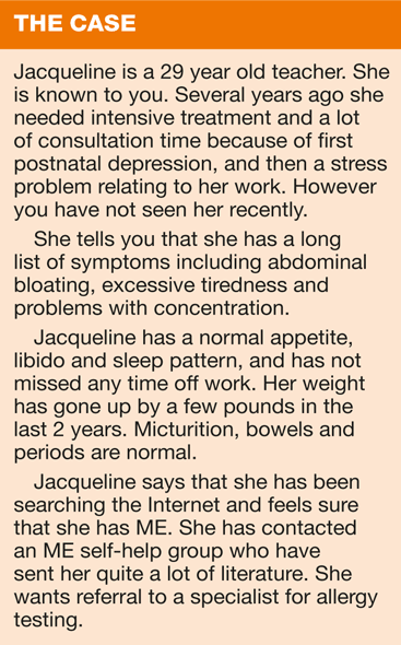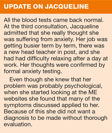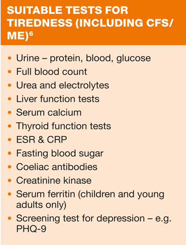 The diagnosis of CFS/ME is based primarily on the history, and the clinician being prepared to accept that the diagnosis is possible. A clinical examination, though recommended,11 is not usually helpful. The focus of the examination should be towards the most prominent features: for example, if there are palpitations then a check of the heart and blood pressure is appropriate. A few investigations designed to exclude other diagnoses can be of help, with the proviso that a diagnosis by exclusion is rarely satisfying to a patient, and the delay in getting the results back can cause anxiety. And, of course, if enough tests are done, eventually one will show an abnormality.12 The tests recommended as suitable are quite extensive. If your patient wasn't anaemic before she probably will be after.