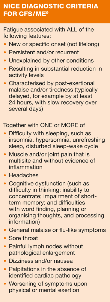 In 2007, NICE produced guidance on the diagnosis and management of CFS/ME9 (see box). NICE says that CFS/ME affects 0.2% - 0.4% of the population, but admit that good epidemiological evidence is lacking.9 A community survey of adults in South East England found that 0.2% of respondents considered themselves to have CFS/ME, but 1% reported some of the diagnostic features.3 The ME Association says that 250,000 people in Britain have ME.10