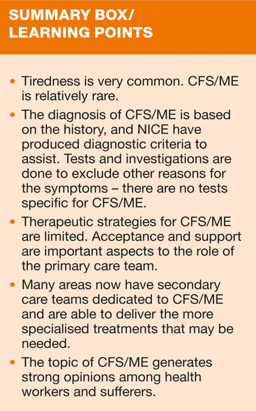 Of patients seen in primary care who have had tiredness for more than 6 months, around a third will fit the diagnostic criteria for CFS/ME.7 CFS/ME is a major cause of illness and disability,1 but all patients with chronic tiredness have significant resulting disability.2