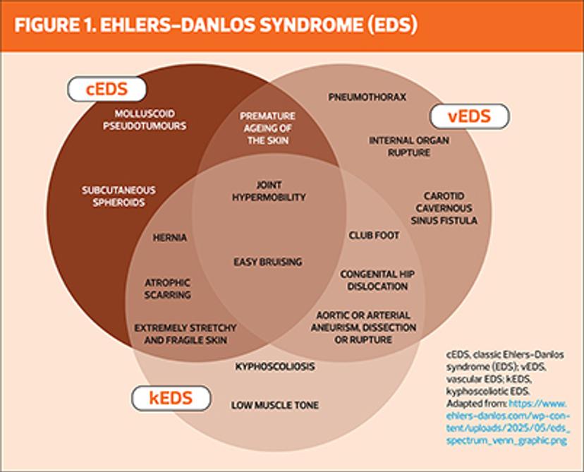 Ehlers–Danlos syndrome (EDS) describes a group of inherited connective tissue disorders characterised by joint hypermobility, skin hyperextensibility and tissue fragility. Hypermobile EDS (hEDS) is the most common subtype and is frequently encountered in primary care. EDS is a multisystem condition affecting the musculoskeletal, cardiovascular, gastrointestinal and autonomic nervous systems. Clinical presentation varies widely, and diagnosis may be delayed due to phenotypic variability and lack of definitive biomarkers for hEDS. Early recognition and appropriate referral are crucial to improve care coordination and long-term outcomes.