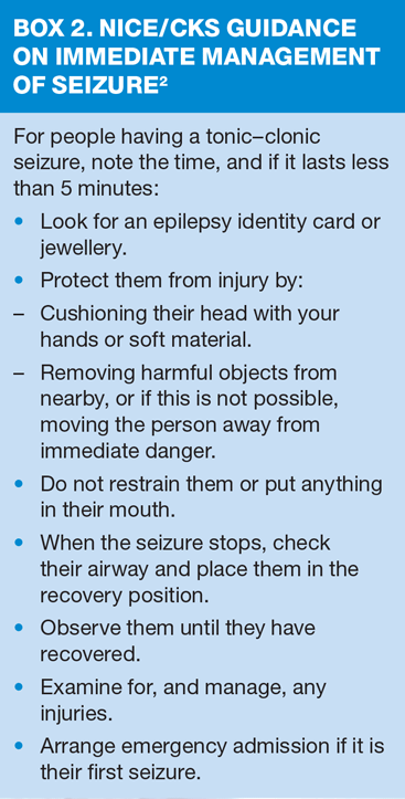 Primary care workers and the family and friends of people with epilepsy should make themselves aware of what to do if a seizure is witnessed. A seizure lasting less than 5 minutes can usually be managed without needing medication. NICE/CKS recommendations are given in Box 2.