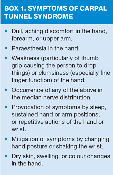 Symptoms can occur in one or both hands. They tend to be worse at night, and a typical story is that your patient is woken from sleep and has to shake the offending extremity (extremities) vigorously to relieve the distress. Box 1 gives a list of symptoms of carpal tunnel syndrome – the more symptoms that are present the more likely is the diagnosis to be confirmed.