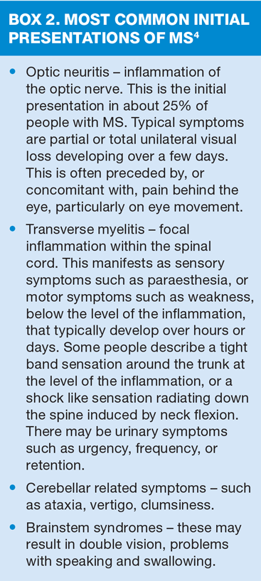 Box 2 lists the most commonly presenting MS symptoms. In the early stages, symptoms may be confined to numbness (often with paraesthesia), perhaps a wobbly gait (due to reduced muscle power and altered sensation in feet), and perhaps double vision or blurred vision.