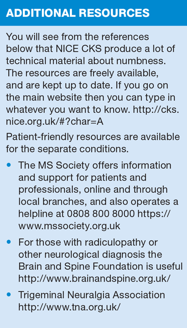 Careful assessment of patients complaining of numbness, and a detailed history, can help to ensure that they are reassured, referred to the GP or to secondary care in a timely way, bearing in mind that even when there is no immediate cause for alarm, these symptoms can be distressing and may be related to an underlying disease requiring further investigation.