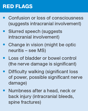 Some features of numbness, or symptoms associated with numbness, will alert you that a serious and urgent disease process is occurring.10 See ‘Red flags’.