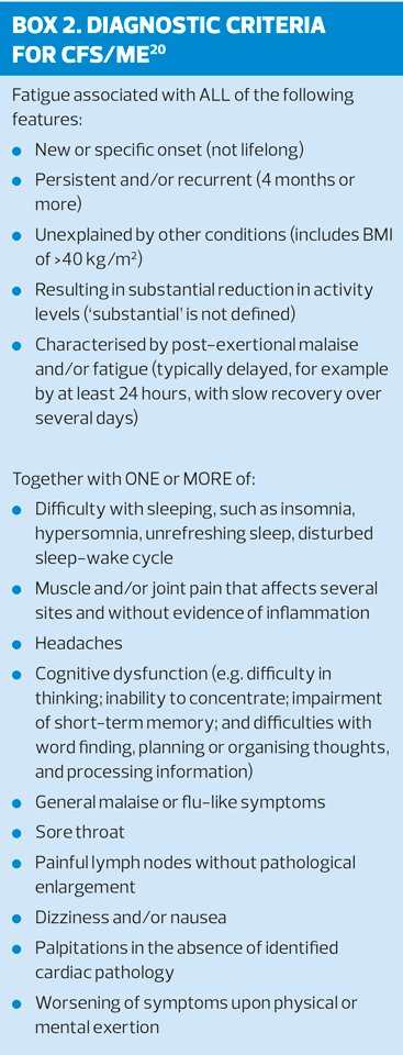 As far as a patient with CFS/ME is concerned, making the diagnosis is seen as the most helpful thing which a healthcare professional can do.25 This requires having positive diagnostic criteria, and at the same time having sufficient regard to the differential diagnosis to be able to exclude other problems.