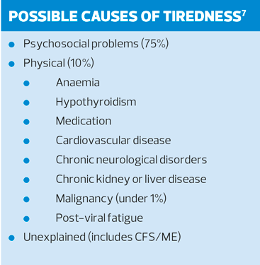As ever, it is important not to miss a serious cause for the tiredness. Serious disease may be rare, but the consequences of a missed diagnosis are significant. The possible causes of tiredness are myriad, so there is a need to explore several avenues as a matter of routine when a patient consults.