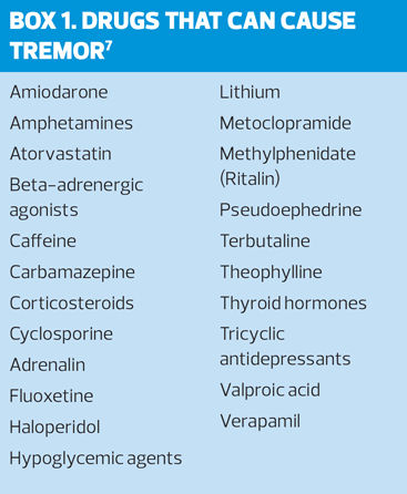 A significant number of prescribed medications can cause tremor. These are usually stimulants such as amphetamines, beta agonists such as salbutamol, and pseudephedrine as is found in several remedies for the common cold, or else psychoactive drugs, typically strong tranquilisers such as haloperidol, but also more widely used drugs such as SSRI – and older tricyclic – antidepressants such as fluoxetine and amityiptylline (Box 1). The key here is to relate when the drug was started (or the dose increased) to the start of the tremor.