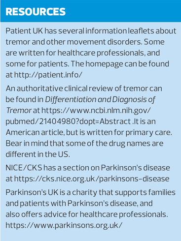 It is unlikely that a GPN will ever be required to make a final diagnosis of a tremor without backup from within the practice and from secondary care. However, GPNs’ skills in talking to patients mean there is a lot of useful information that can be gathered.10