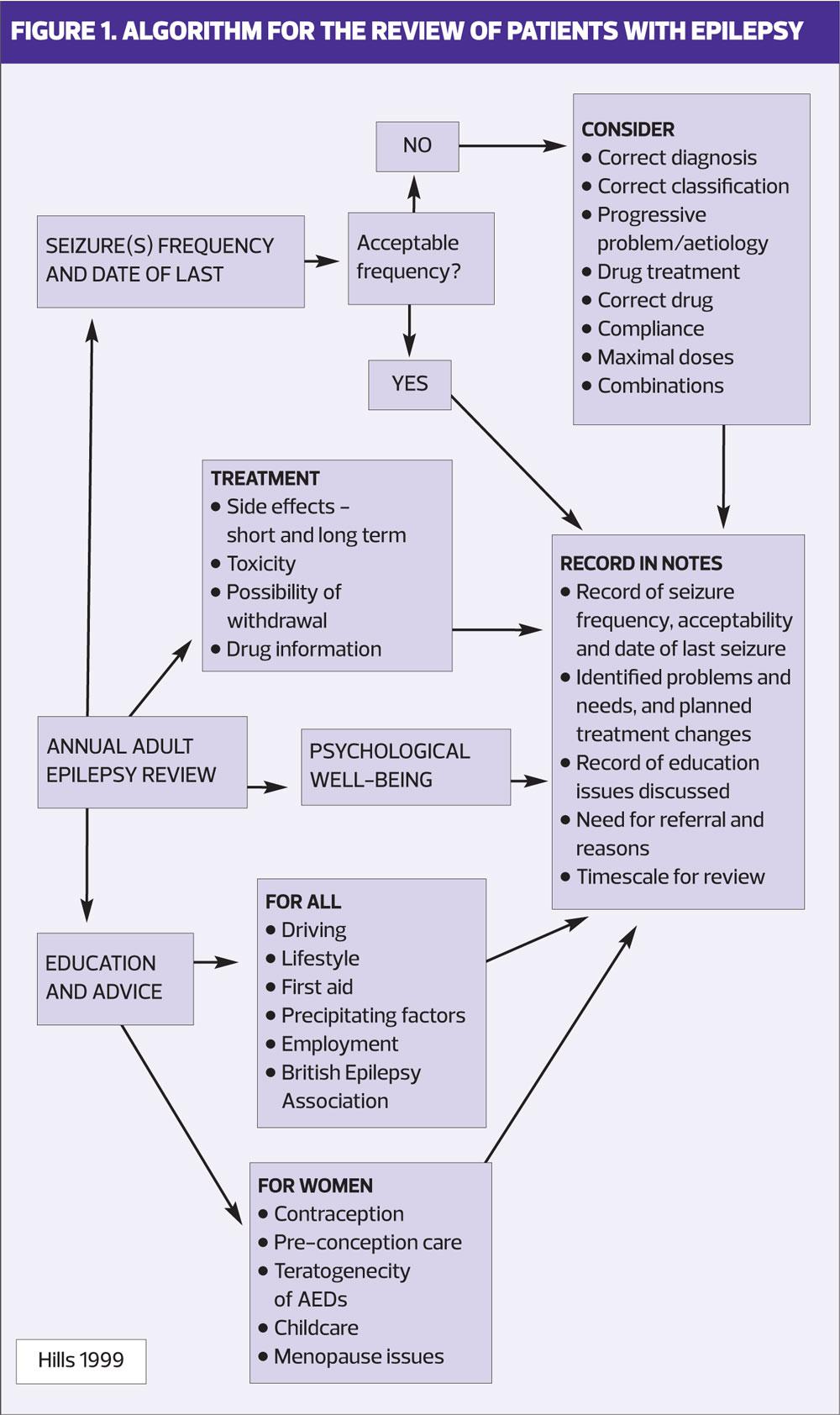 The NICE guideline on epilepsy (CG137),4 recommends that all adults with epilepsy have a regular, structured review with their GP at least yearly, although this can be carried out by the specialist if circumstances or the patient’s wishes dictate.