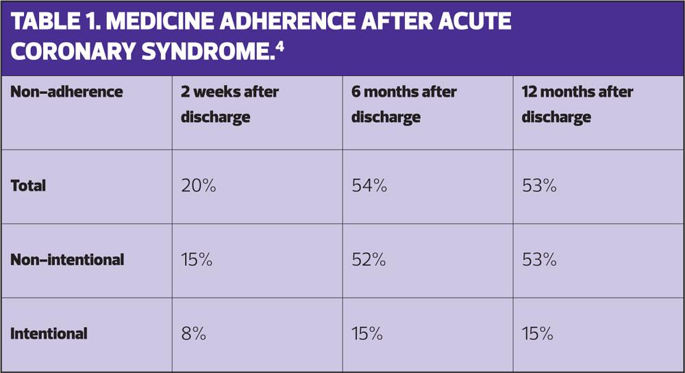 In a study on medication adherence in the year immediately after acute coronary syndrome (ACS), total medication non-adherence was 20% two weeks after discharge, 54% six months after discharge and 53% twelve months after discharge. Interestingly the corresponding figures for intentional non-adherence were 8%, 15% and 15% and for unintentional non-adherence 15%, 52% and 53%.4 In this study, perhaps due to the turbulence and vulnerability created by an episode of ACS, people forgot to take medication, or could not access it, and this unintentional non-adherence increased significantly in the first six months after discharge. (Table 1)