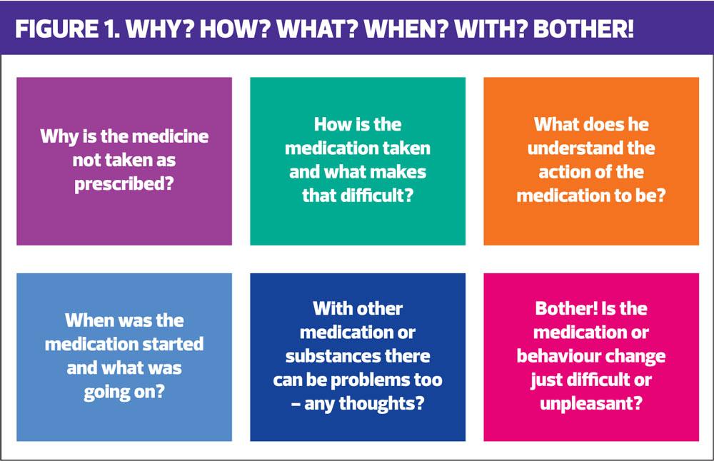 This could be seen as ‘Why? How? What? When? With? Bother!’. (Figure 1) Use such prompts to identify reasons for non-adherence. With more information, you can look for solutions together.