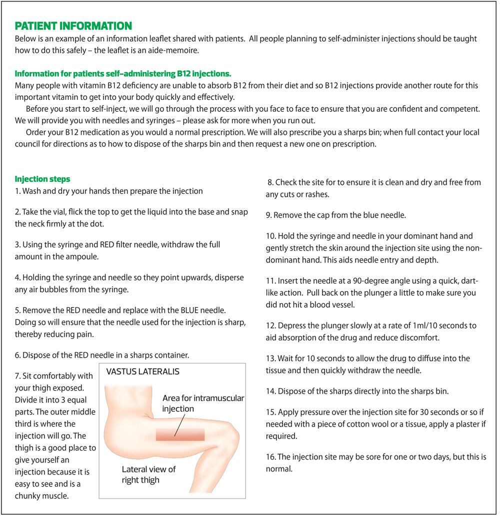 Vitamin B12 plays an essential role in many of the body’s systems. B12 deficiency can occur as the result of inadequate dietary intake or because of impaired absorption. Depending on the cause of B12 deficiency, oral or injectable replacement therapy will be recommended. In pernicious anaemia, lifelong B12 injections will be needed, and people may prefer to do these themselves in their own homes. Whether given by a healthcare worker or by the individual, correct procedures should be followed with regard to prescribing, injection technique, infection control and sharps disposal. Ongoing monitoring may be required.