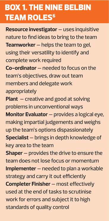 Another interesting method of describing team behaviours is described by Belbin.6 The Belbin Team Roles method has identified nine different clusters of behaviours that are displayed in the workplace (Box 1). Each of the roles described also includes a description of the strengths and allowable weaknesses of the role. Effective teams need a mixture of the behaviours, although all nine are not essential. Each role within the team will have strengths and weaknesses. Knowing where these strengths and weaknesses allow the team to work effectively.