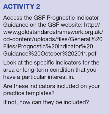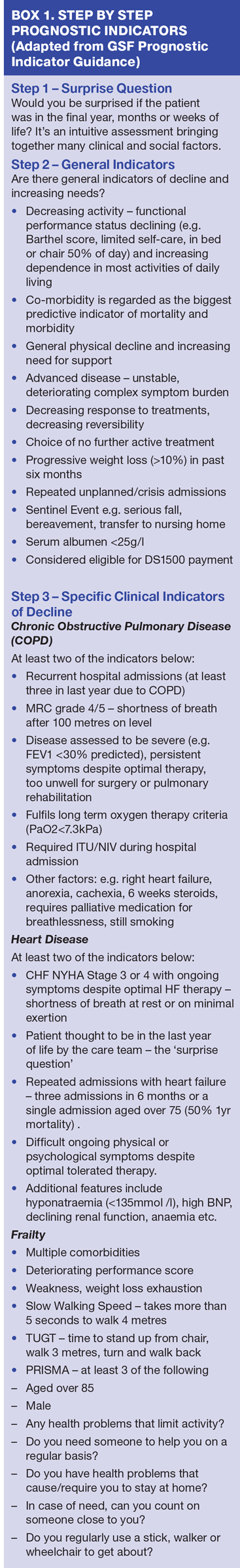 The GSF primary care programmes can support practices to improve earlier identification of patients,6 and in particular those with non-cancer and those from care homes The GSF Prognostic Indicator Guidance,7 is a tool which many practices have adopted and found to be a valuable means of identifying patients in the final years, months or weeks of life at an earlier stage. It has also been widely used internationally and in different settings, and there is now strong evidence of its use in aiding the identification of the proportion of patients in their last year of life in hospitals.8 It lays out a simple step-by-step process. Box 1 describes some of the specific clinical indicators of decline and more detailed information can be found on the GSF website.