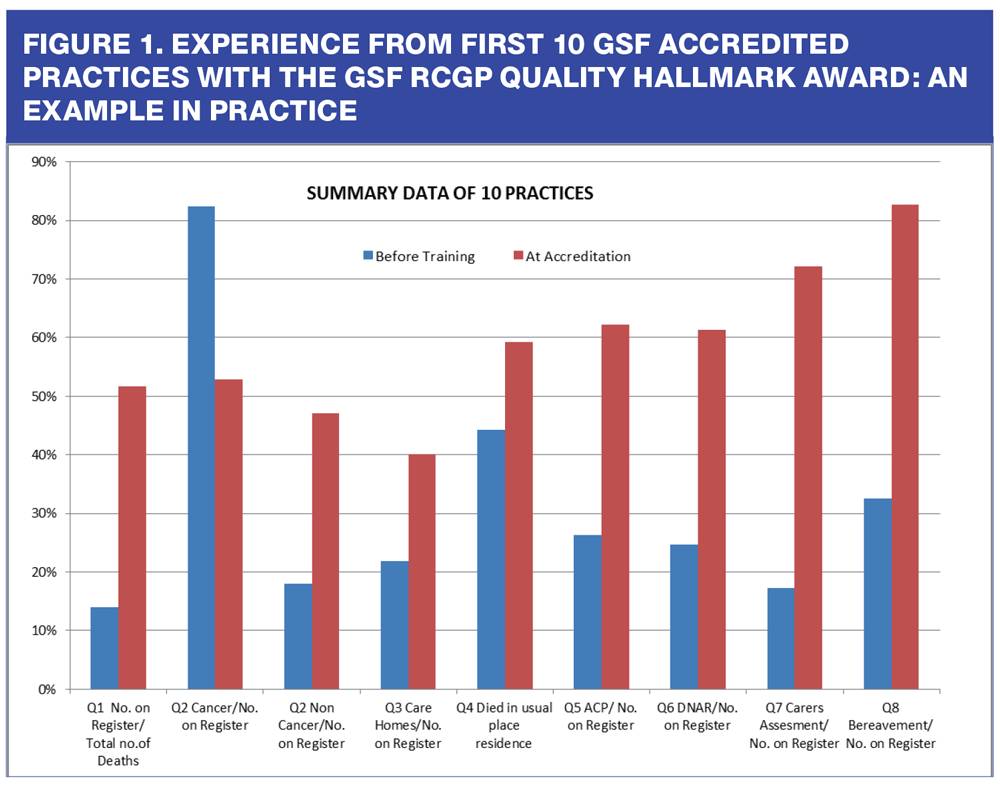 The National GSF Centre is the leading provider of quality improvement training in EOLC for generalist frontline staff in the UK.10 The Gold Standards Framework Primary Care Programme began in 2000 and, by 2010, most practices had adopted basic level GSF, including a register of these patients and holding meetings to discuss them. Following a systematic review of GSF in primary care, there is good evidence for the benefit of this approach.11 Accreditation is supported by the General Medical Council. More than 95% of GP practices in England and Wales have introduced GSF to foundation level and a further 600 have undertaken the GSF Going for Gold or Silver programme.12,13