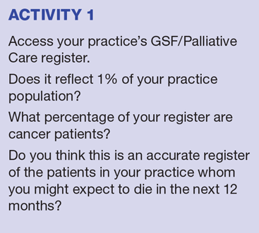 An estimated 1% of the population are in their last year of life. All GPs have palliative care/Gold Standards Framework (GSF) registers, mainstreamed in 2004 through the Quality Outcomes Framework (QOF) (basic or bronze level GSF), but there is a lot more that can be done. Only about a quarter of all people who die have been identified and are on the register,5 and many GPs are trying to increase the numbers of patients on their palliative care/GSF registers.