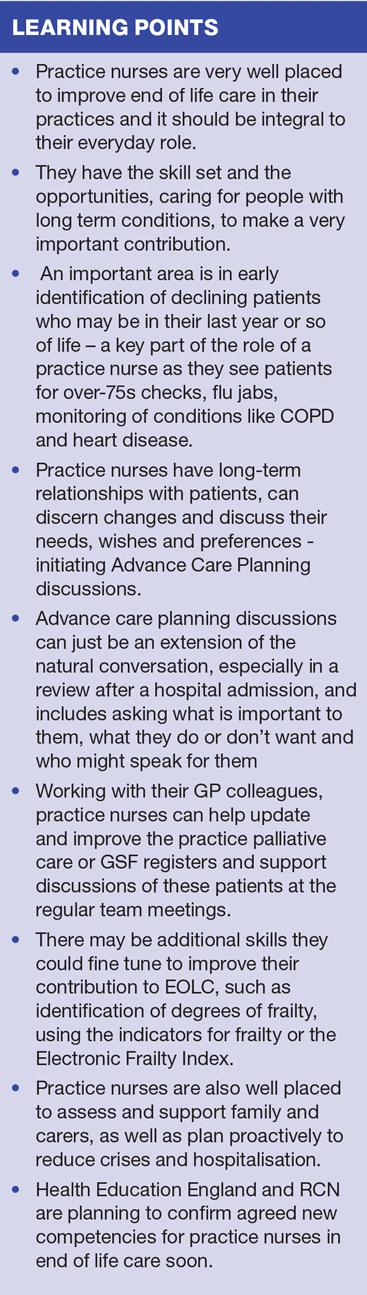 Practice nurse have the skill set, the opportunities presented by caring for people with LTC and the abilities to make a very important contribution. A recent report for Health Education England (HEE) affirmed the importance of education in EOLC for all generalist staff, including practice nurses and others in primary care teams,4 and there are soon to be agreed competencies in EOLC defined by HEE and RCN.